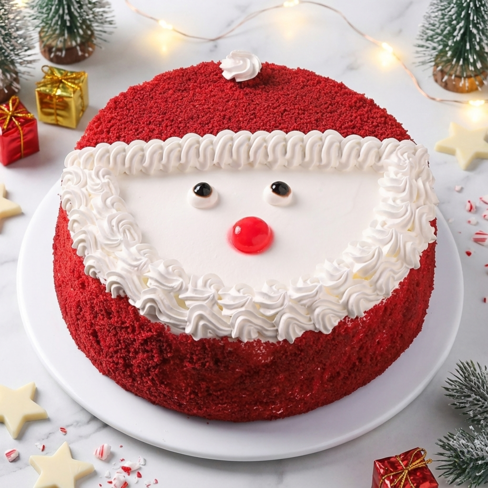This festive red velvet cake combines sophisticated flavor with seasonal charm. Featuring a charming Santa design, it delivers a velvety crumb structure with creamy frosting that balances richness and elegance. The round shape and premium cream composition make it an ideal centerpiece for holiday celebrations or a distinguished gift for discerning recipients. Each slice offers the distinctive taste profile red velvet is renowned for, while the thematic presentation adds memorable appeal to your festive gathering.